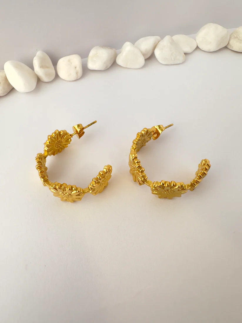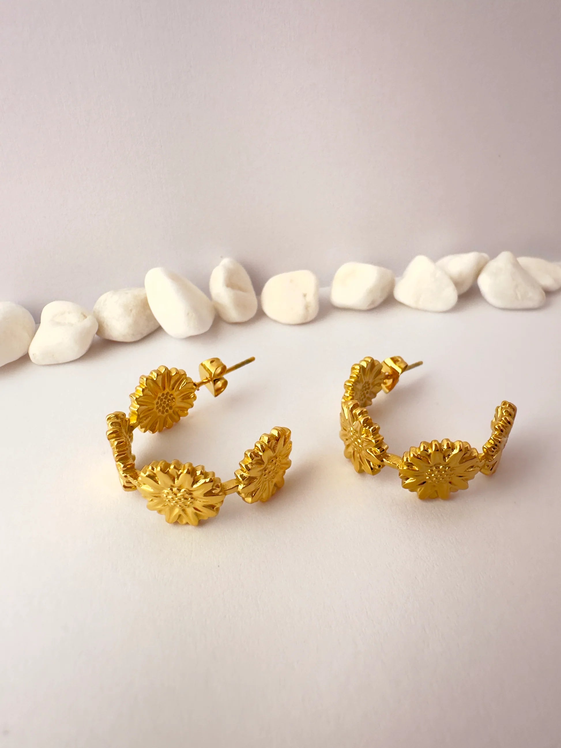 Un diseño lleno de luz y energía, estas argollas florales de triple caída evocan la frescura de la primavera con un acabado dorado intenso y texturizado. Cada flor tiene volumen y presencia, ideales para looks vibrantes y femeninos.