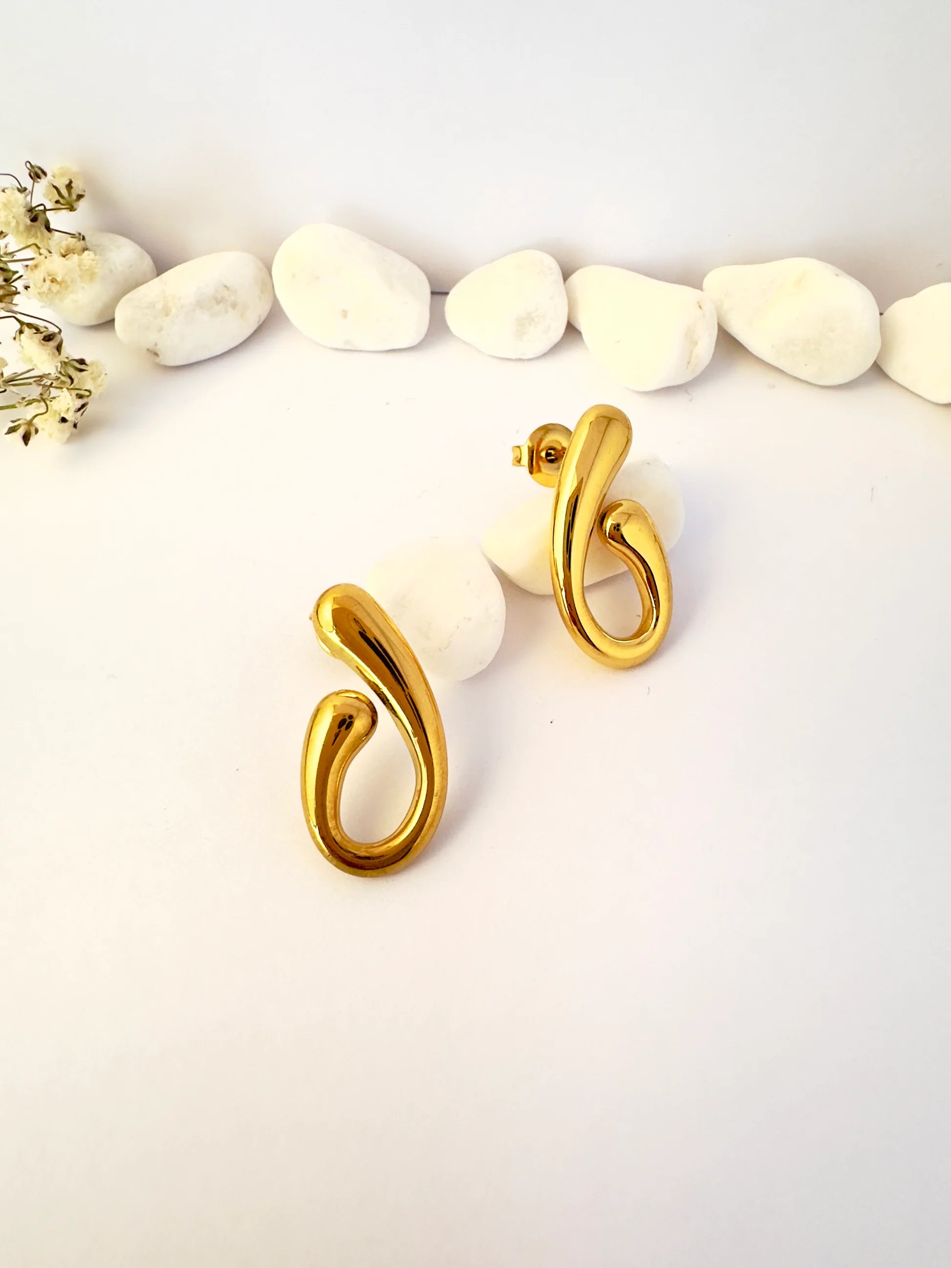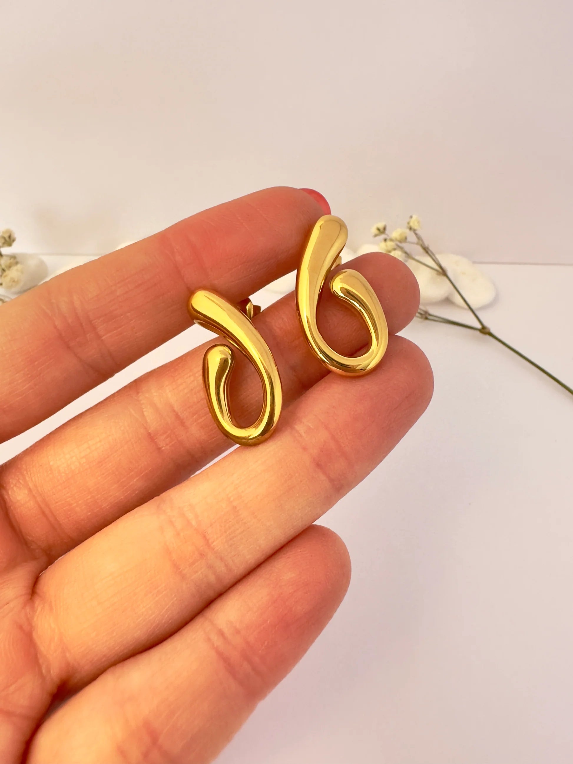 Pendientes elegantes dorados de acero inoxidable , con forma fluida y asimétrica que aporta un toque artístico y moderno. Su silueta abstracta realza el rostro con elegancia sutil y carácter vanguardista. Fabricados completamente en acero inoxidable, con enchapado en oro de 18k de 4 micras para un acabado brillante, duradero y resistente.