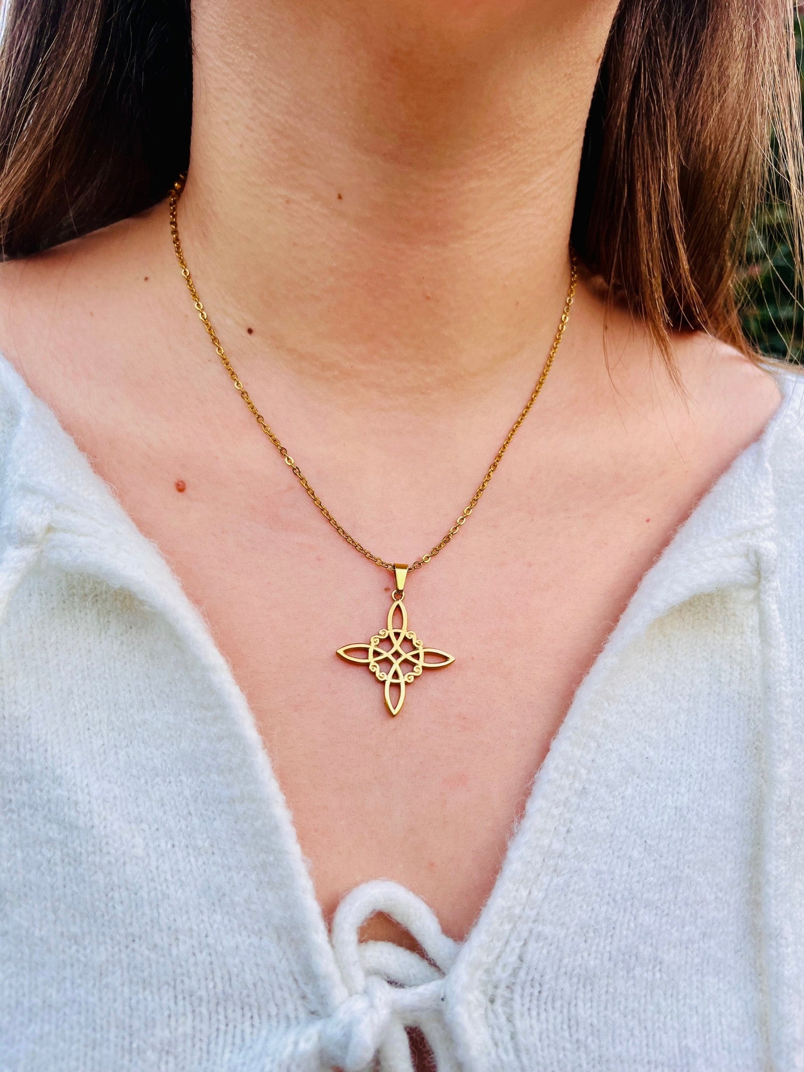 Inspirado en antiguos símbolos de protección, este collar con dije de nudo celta evoca energía, equilibrio y conexión espiritual. Su diseño elegante, abierto y simétrico lo convierte en una joya de alto impacto visual y con gran significado.